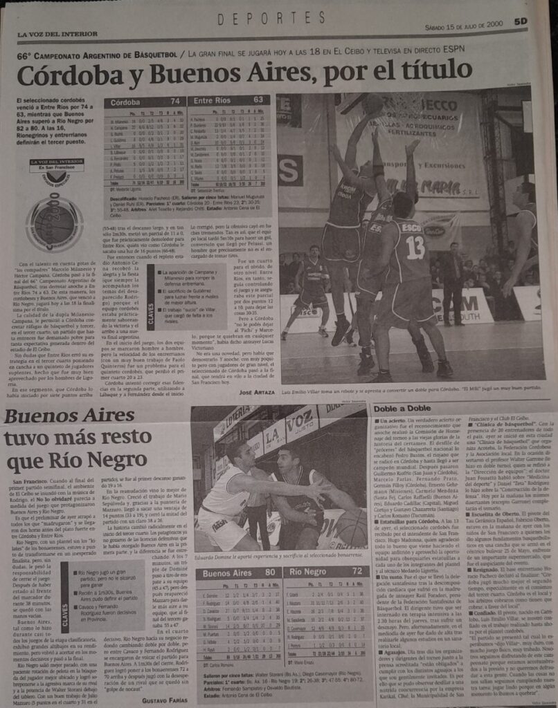 El juego más importante y esperado del torneo se disputó el día 15 de julio del año 2000. La ciudad de San Francisco se paralizó por completo para vivir lo que fue la inolvidable definición de este campeonato. La multitud distribuida en las gradas del estadio “Antonio Cena”, de la Asociación El Ceibo, fue testigo del reñido triunfo de la selección de Córdoba sobre Buenos Aires (72-67) con 22 puntos del goleador Héctor ‘Pichi‘ Campana.