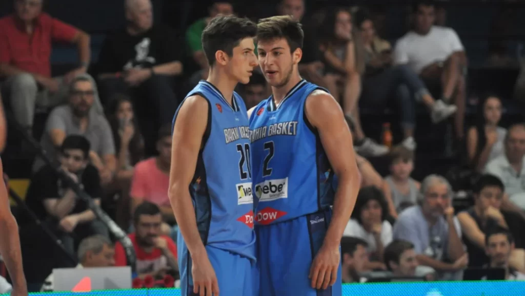 LEA JUNTO A MÁXIMO FJELLERUP CON LA CAMISETA DE BAHÍA BASKET EN UN JUEGO DE LA LNB