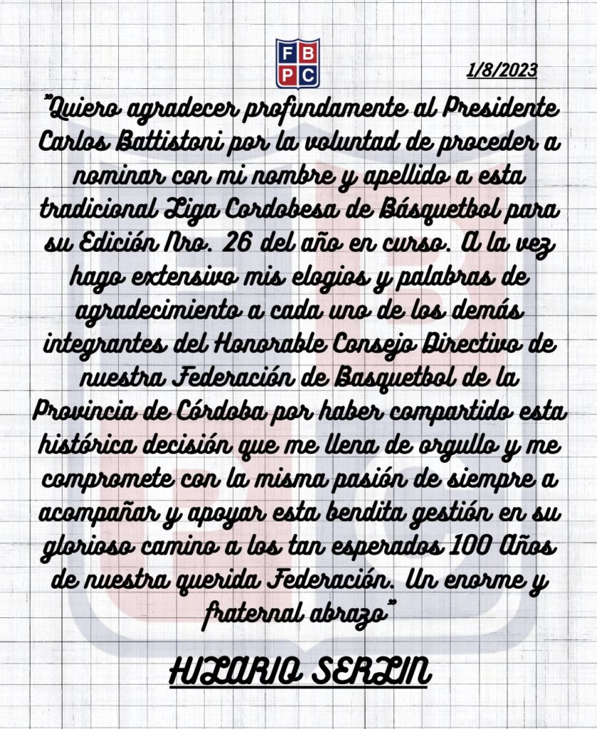 🗣️Luego de haber recibido la noticia de que la edición de este año lleva su nombre y apellido, Hilario Serlin expresó que “esta histórica decisión me llena de orgullo y me compromete con la misma pasión de siempre a acompañar esta bendita gestión en su camino a los 100 gloriosos años de nuestra querida Federación”