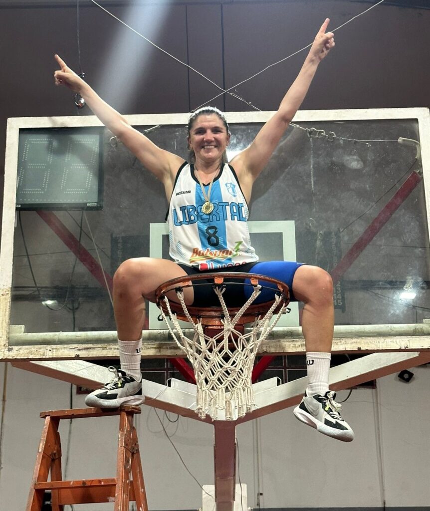 La capitana de Libertad Trinidad, Paula Mainero, festejando encima del aro el título de la Liga de Mayores femenina 2023