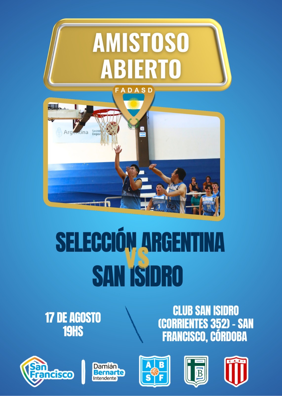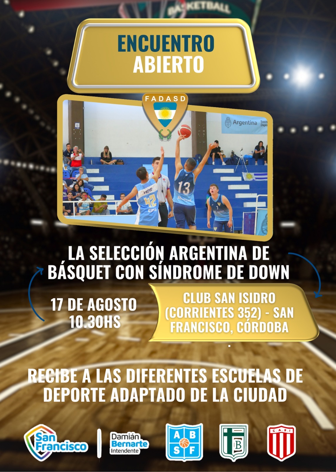 Esta actividad está organizada por la Federación Argentina de Deportes para Atletas con síndrome de down (FADASD), quien se contactó con el Departamento de Deporte Adaptado del Club Sportivo Belgrano sumando al Club San Isidro como sede de los diferentes entrenamientos. Asimismo, la Municipalidad de San Francisco y la Asociación de Básquet de nuestra ciudad apoyan esta iniciativa.