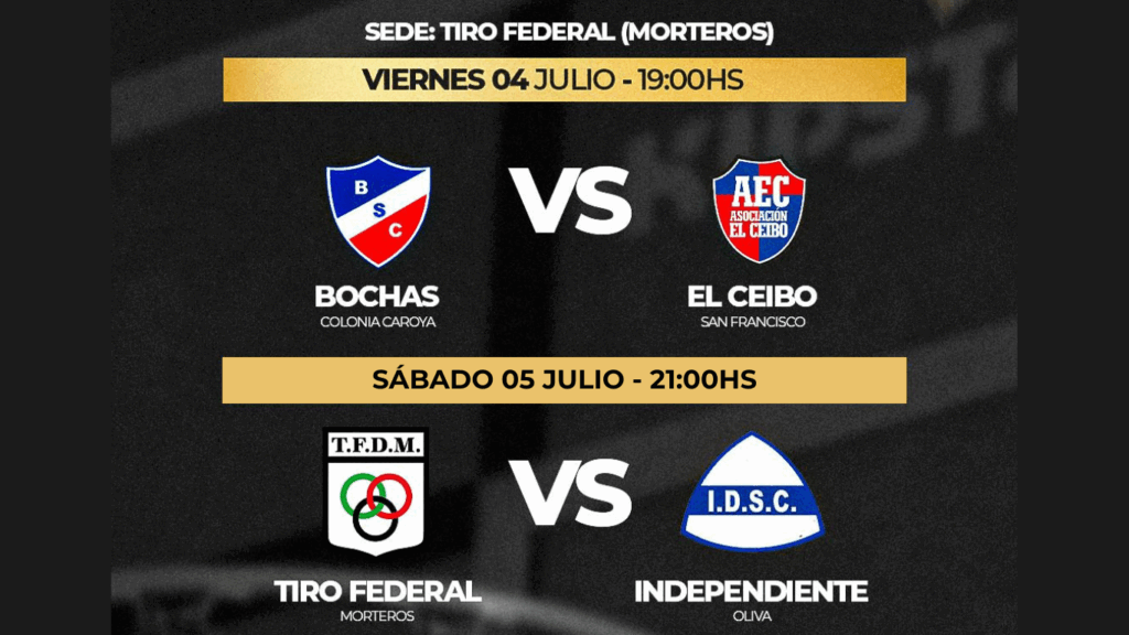 Todo listo para vivir la definición de la Liga del Centenario U21 masculina. Bochas Sport (Colonia Caroya), Independiente (Oliva), El Ceibo (San Francisco) y Tiro Federal jugarán entre sí este fin de semana. Todos los detalles del Súper Cuatro que se realizará los días viernes 4 y sábado 5 de julio, en la ciudad de Morteros.