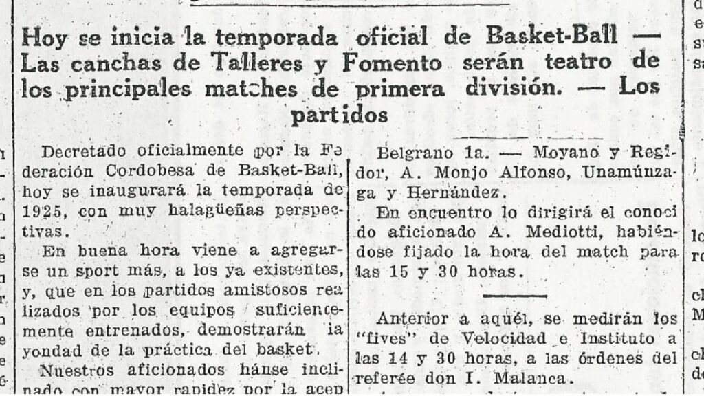 El diario La Voz del Interior, en un artículo publicado el 2 de julio de 1929, resaltaba la difusión del nuevo deporte: “Resulta un índice halagador de lo que será el basket-ball en nuestro medio, en un futuro no lejano, la marcada difusión que día a día cobra este deporte entre nosotros. Es un hecho que veníamos comprobando desde hace algún tiempo, no sólo por la cantidad de jóvenes que se dedican a su práctica, sino también por la aceptación que le dispensan, en general, los aficionados locales”.